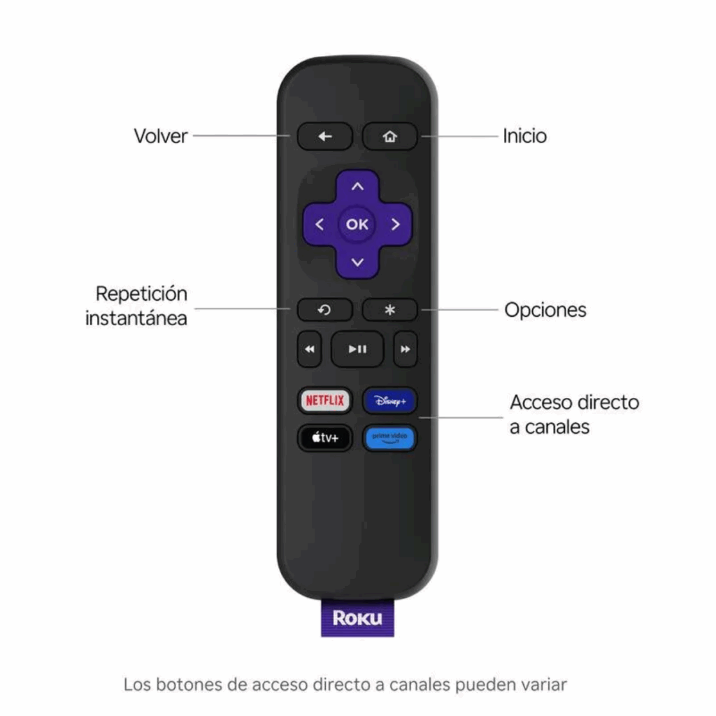 Incluye un control remoto simple y cómodo, con botones directos a tus plataformas favoritas como Netflix, Disney+, Apple TV y YouTube. Sin complicaciones, sin vueltas.
